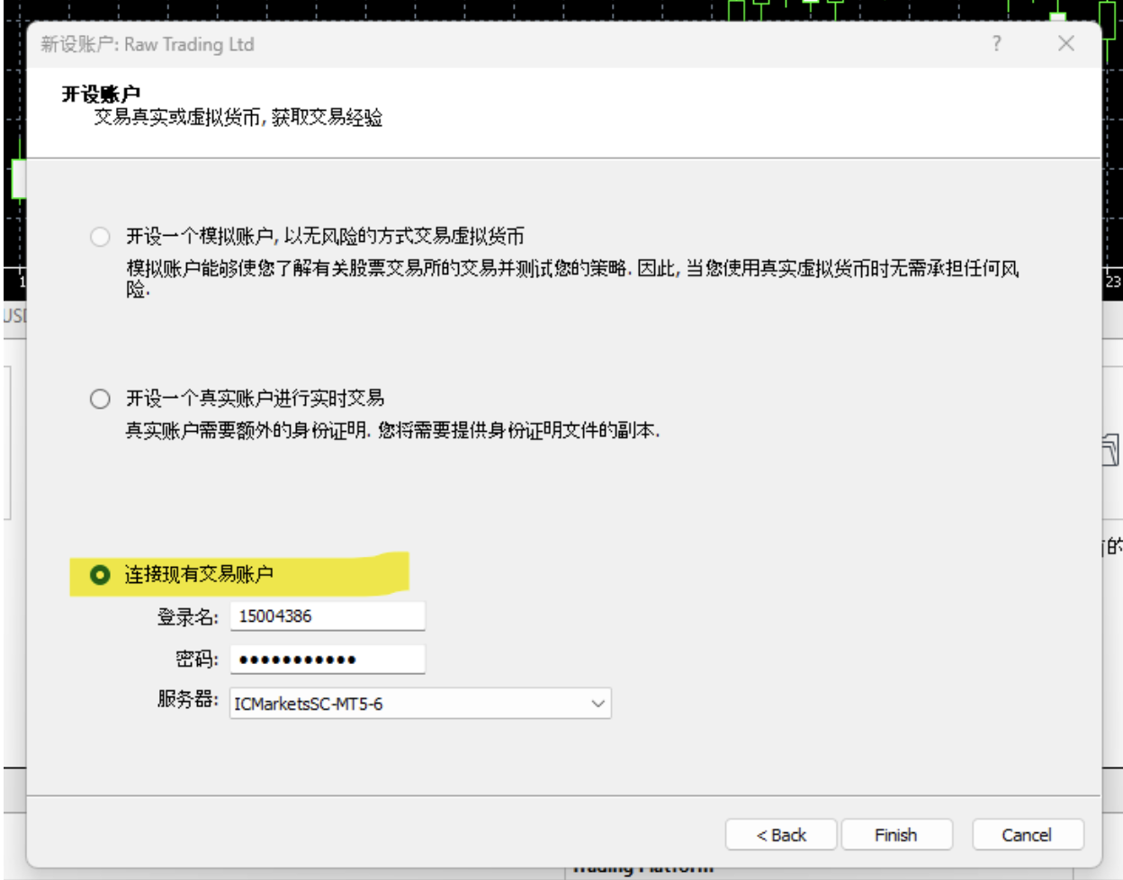 5.选择 Connect with an Existing Trade Account(连接现有交易账户)。