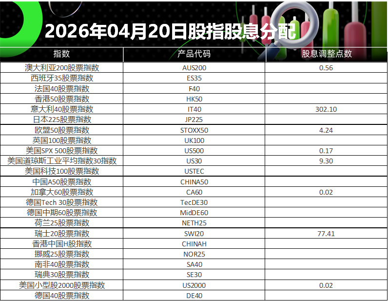 20 Apr 2026 2026年04月股指股息分配表 (2026-04-20) Rachel Yu No Comments 亲爱的客户您好, 请查阅我们更新的2026年04月20日股指股息分配表。 以下所有时间均为平台时间(GMT+3) IC Markets Global 中文团队 中文官网: http://icm-cn-asia.com Email: support.cn@icmarkets-cs.com 微博:@IC小帮手