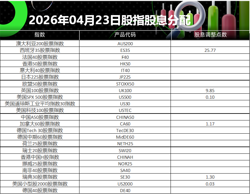 23 Apr 2026 2026年04月股指股息分配表 (2026-04-23) Rachel Yu No Comments 亲爱的客户您好, 请查阅我们更新的2026年04月23日股指股息分配表。 以下所有时间均为平台时间(GMT+3) IC Markets Global 中文团队 中文官网: http://icm-cn-asia.com Email: support.cn@icmarkets-cs.com 微博:@IC小帮手