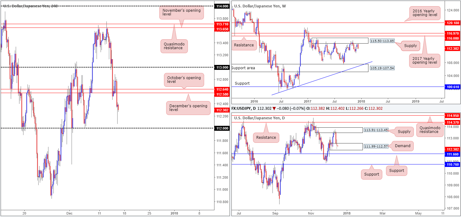 The USD/JPY sustained further losses on Thursday, despite an earnest attempt to push higher from December/October’s opening levels seen on the H4 timeframe at 112.58/112.64 (bolstered by upbeat US retail sales and weekly unemployment claims). Alongside the US equity market, the USD/JPY tumbled lower as we entered the US session, reaching a low of 112.06, missing the 112 handle by a hair.