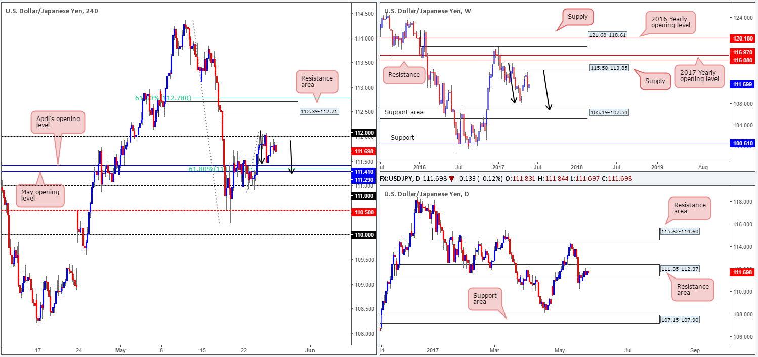 Our suggestions: A bounce is highly likely to be seen from 111.29/111.41. How much of a bounce though is difficult to judge since a long from here would entail going up against potential weekly/daily sellers. If you still intend on going long from this region, we would strongly advise using strict trade management, since getting caught on the wrong side of higher-timeframe flow would not be pleasant!