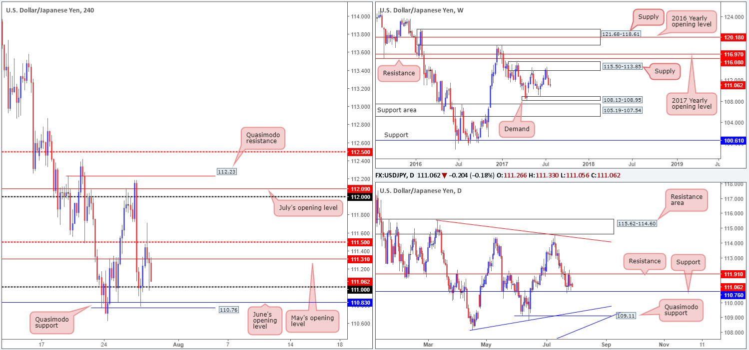 Our suggestions: Personally, there is very little that interests us at the moment. Stop-loss orders have likely all been squeezed below 111 and the buy orders from the H4 Quasimodo support at 110.76/June’s opening level at 110.83 have also likely been consumed. Why not sell then? Good question! The simple reason we are not willing sellers here is due to the daily support at 110.76! Given its history, it is very difficult to judge whether this level is on the verge of giving way or not. It is just not worth the risk, in our humble opinion.