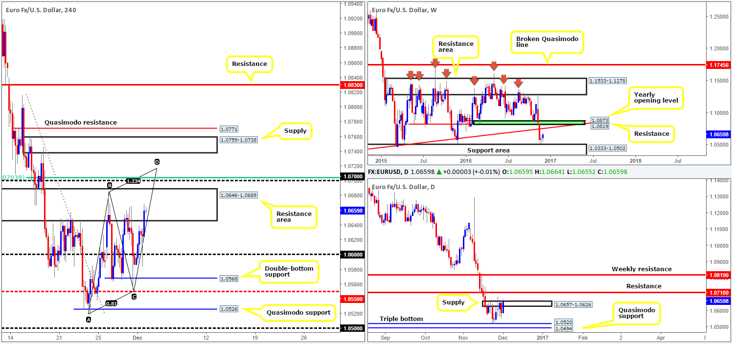 With the buyers and sellers once again seen battling for position around a H4 resistance area at 1.0646-1.0689, our desk has eyes on the 1.07 neighborhood today. Granted, price will have to tackle the current H4 resistance area and the rather beaten-up daily supply at 1.0657-1.0626 before reaching this level, but think of all those buy stops sitting just above these zones! 1.07 also sits just 10 pips below a daily resistance at 1.0710, fuses with a nearby H4 AB=CD bearish formation at 1.0715 and a H4 61.8% Fib resistance (green line) at 1.0703.