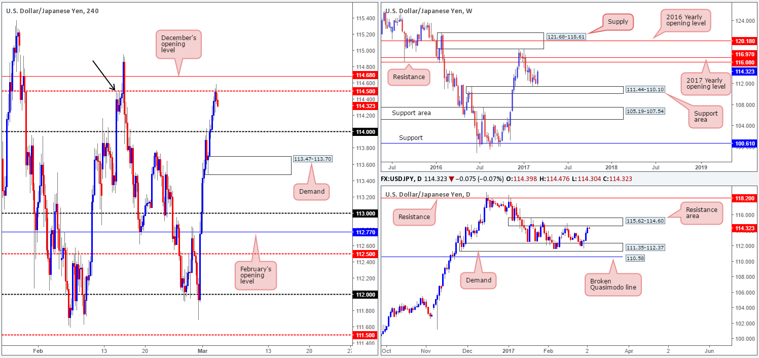 In recent sessions, the USD/JPY printed its fourth consecutive daily bullish candle and drove the unit up to within an inch of the daily resistance area coming in at 115.62-114.60. Also of note is the H4 candles recently connecting with the H4 mid-way resistance point at 114.50 (the black arrow represents a H4 Quasimodo left shoulder that converges with the 114.50 number), which is shadowed closely by December’s opening level at 114.68.