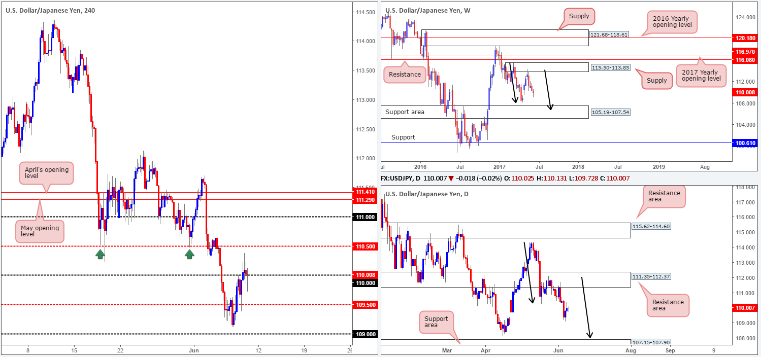Our suggestions: With that, we feel the H4 mid-level resistance 110.50 is a possible level to sell from given how well it held as support throughout May (see green arrows). To prove seller interest, however, we would advise waiting for a reasonably sized H4 bearish candle to take shape, preferably a full-bodied candle.