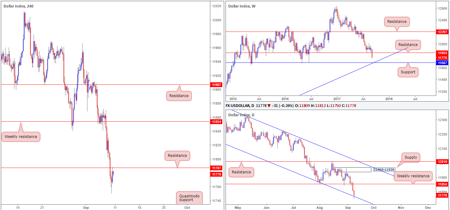 A quick recap of Friday’s trading on the H4 chart shows price topped at 1.2092 during the early hours of Europe, and ended the day in negative territory. To the downside, the next area of interest is the large psychological barrier 1.20, followed closely by a support area positioned at 1.1984-1.1962. In between these two structures, we’ve shaded the area in yellow to represent a potential fakeout zone. Why? Well, psychological numbers have a tendency to be whipsawed (a fakeout), and the yellow area is likely where you’ll see this occur should it happen. A quick glance at the USDX H4 chart, nevertheless, sees price trading from resistance at 11787 with room to stretch as far down at 11728: a H4 Quasimodo support level not seen on the screen. Therefore, there’s a chance we may see EUR H4 bulls come into the fray before connecting with 1.20.