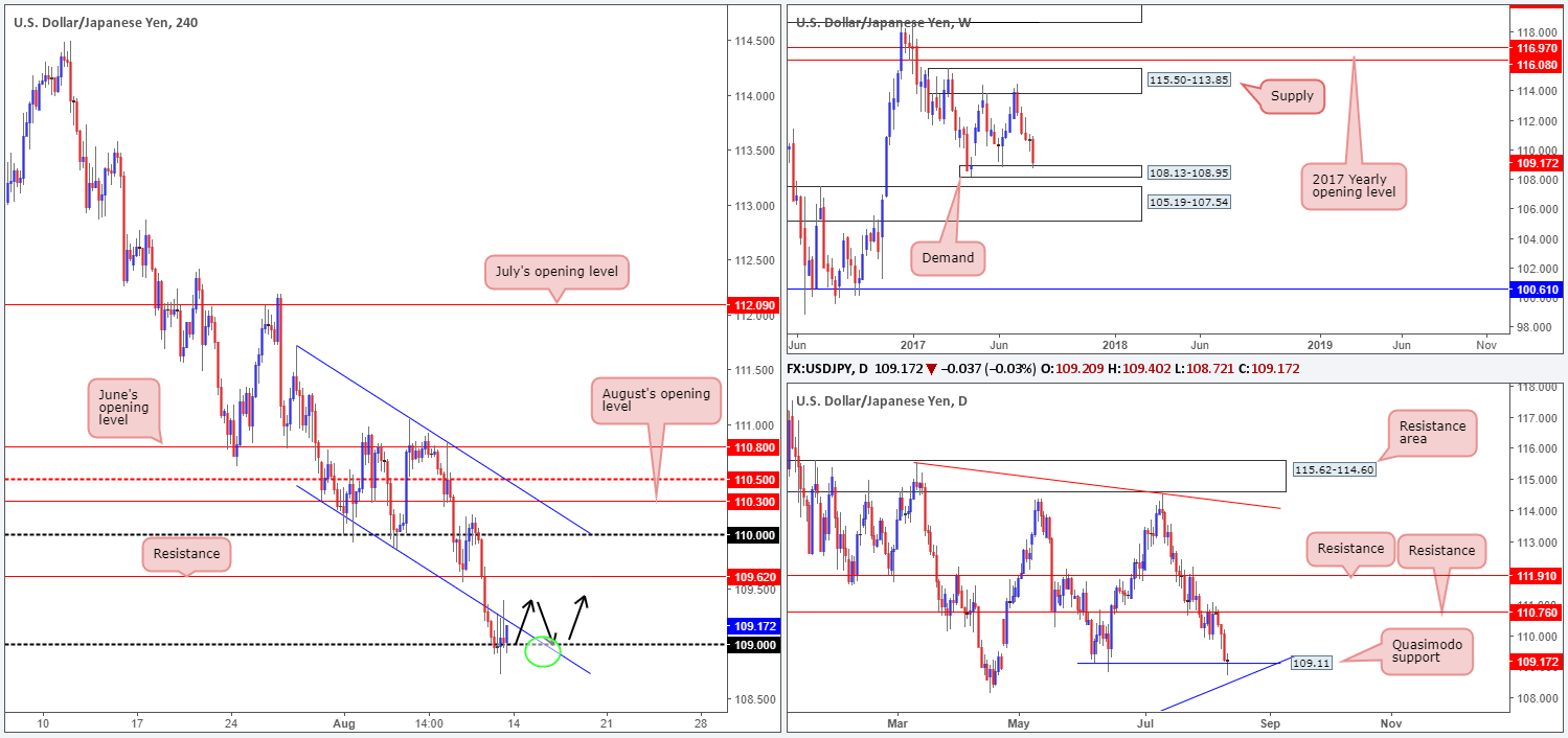 Friday was a quiet day in the market, with H4 price seen clinging to the 109 handle. Collectively, as we mentioned in Friday’s report, all three timeframes show structure suggesting a buy in this market. The question still remains however, how does one go about finding an entry? Simply clicking the buy button, in our opinion, just won’t do given the strength of the approach seen into the above said supports.