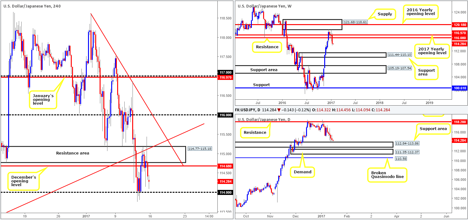 Looking at Friday’s session on the H4 chart shows us that the H4 resistance area at 114.77-115.18, along with the H4 trendline resistance taken from the low 112.86, successfully capped upside. The next downside hurdle on this scale is the 114 band, which, with the help of the top edge of the daily support area mentioned above, bolstered this market on Thursday. Assuming that 114 gives way, this potentially opens the doors for price to challenge H4 support seen at 113.28.