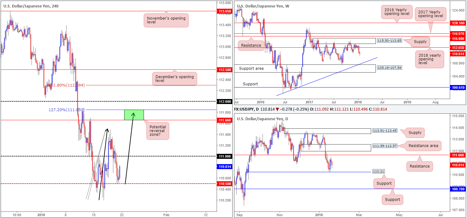 Branching over to the H4 timeframe, the pair attracted fresh buyers from the H4 mid-level support at 110.50 in early London hours on Friday, eventually pulling the unit to a high of 110.84. A significant close above the nearby 111 handle would, as far as we can see, open up the trapdoor for price to challenge the aforementioned daily resistance. Alongside this, the approach would also likely meet the characteristics required for an AB=CD (black arrows) H4 bearish formation, topping at 111.85 (127.2% Fib ext. point).