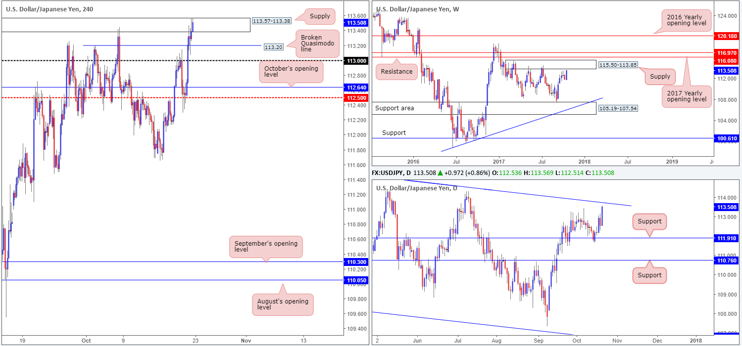 A closer look at price action on the H4 timeframe, nonetheless, shows that the unit concluded the week closing within the upper boundaries of a supply area coming in at 113.57-113.38. Though this zone has already proved its worth back on the 6th October, it is not somewhere we would consider selling from. Preferably, we would like to see the 114 handle brought into the picture before we consider a short. Not only is 114 seen within the lower range of the noted weekly supply, it also aligns nicely with the aforesaid daily channel resistance.
