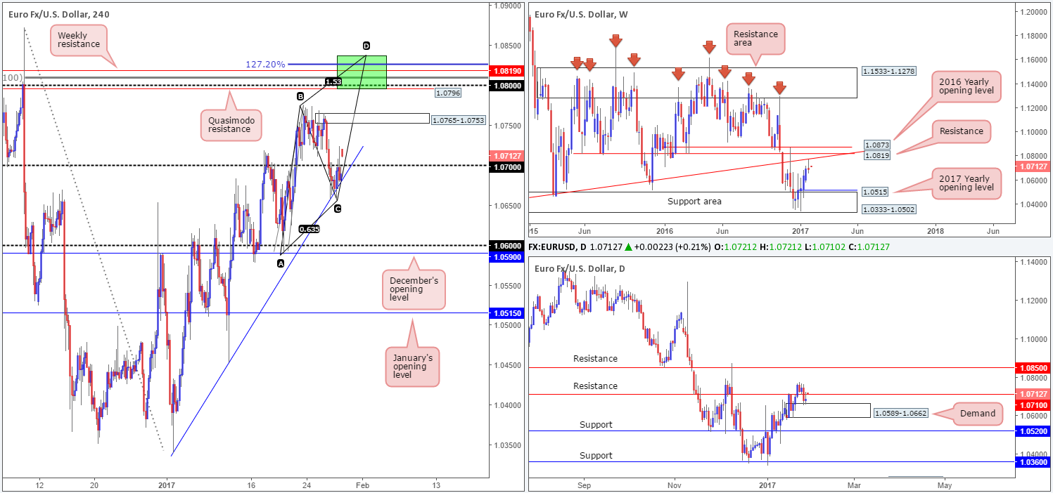 One could look for an intraday bounce from the H4 supply today, but be aware that the more attractive area for sells is seen around the H4 Quasimodo. Backing this level we have the 1.08 handle, a deep H4 88.6% Fib resistance at 1.0810, weekly resistance at 1.0819 (sits just above the aforementioned weekly trendline resistance) and finally there’s also a possible H4 AB=CD bearish pattern that tops out around 1.0838 which sports a converging 127.2% Fib extension.