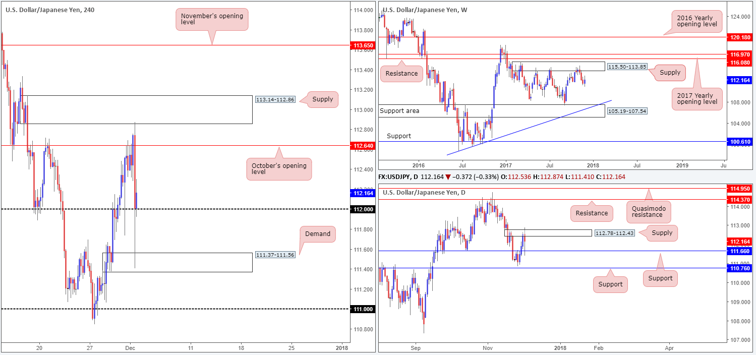 For those who read Friday’s report, you may recall that the desk was interested in selling the 1.29 handle/November’s opening level at 1.2892 (H4 timeframe). We also mentioned that in order for this zone to be considered valid, a full or near-full-bodied H4 bearish candle would also be required. As you can see, there was a nice-looking H4 signal candle printed in the early hours of Friday. Unfortunately though, we were away from the desk at the time! Well done to any of our readers who caught this move – a stunning way to end the week!