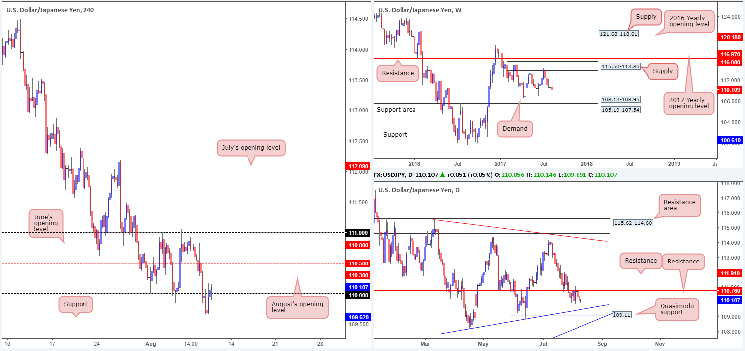 Our suggestions: Seeing as H4 structure is rather cluttered above 110 at the moment, along with both weekly and daily price still showing room for further downside, we will not be considering any trades in this market today.