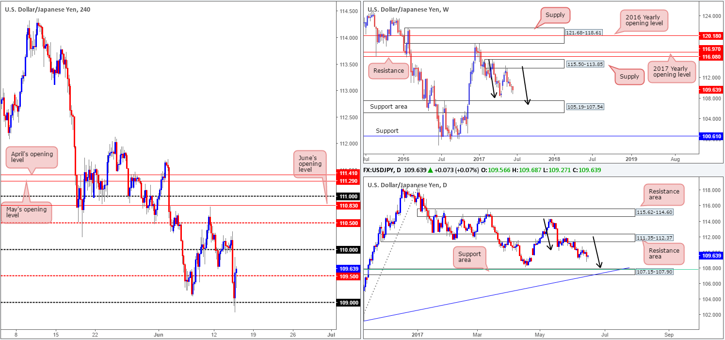 The USD/JPY suffered a blow to mid-section yesterday after below par US inflation and retail sales data hit the wire. Pushing through both the 110 handle and also the H4 mid-level support at 109.50, the pair shook hands with the 109 handle as we entered the US segment. The Fed, as expected, lifted the benchmark interest rate by 25bps, confirming support around 109 and pushing price back above the 109.50 barrier by the close.