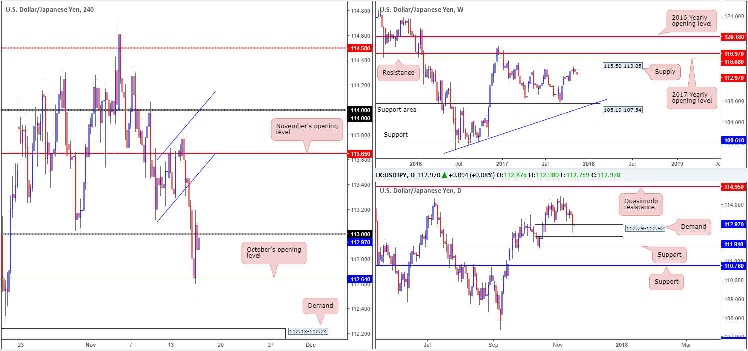 Suggestions: We would not look to trade between 113 and 112.64. The range is just too small for our liking. A H4 close above 113, nevertheless, may be enough to spark further buying up to November’s opening level at 113.65, considering that daily price is trading from demand. In spite of this, buying this market would also entail going up against weekly selling!
