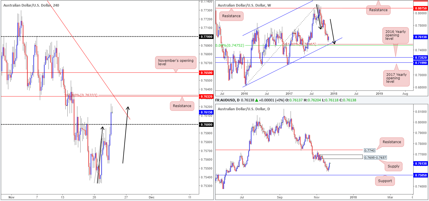 - Sells: 0.7632 region ([waiting for a reasonably sized H4 bearish candle to form – preferably a full or near-full-bodied candle – is advised] stop loss: ideally beyond the candle’s wick).