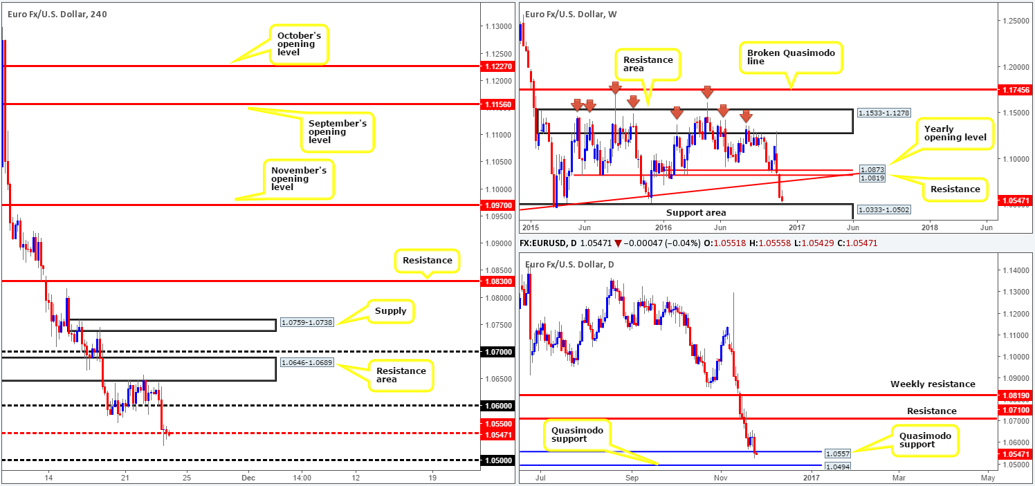 Over on the bigger picture, we can see that weekly action is now trading within touching distance of a major support area coming in at 1.0333-1.0502. Meanwhile, thanks to yesterday’s selloff, the daily Quasimodo support at 1.0557 was consumed and has potentially opened the floodgates down to 1.0494: another Quasimodo support!