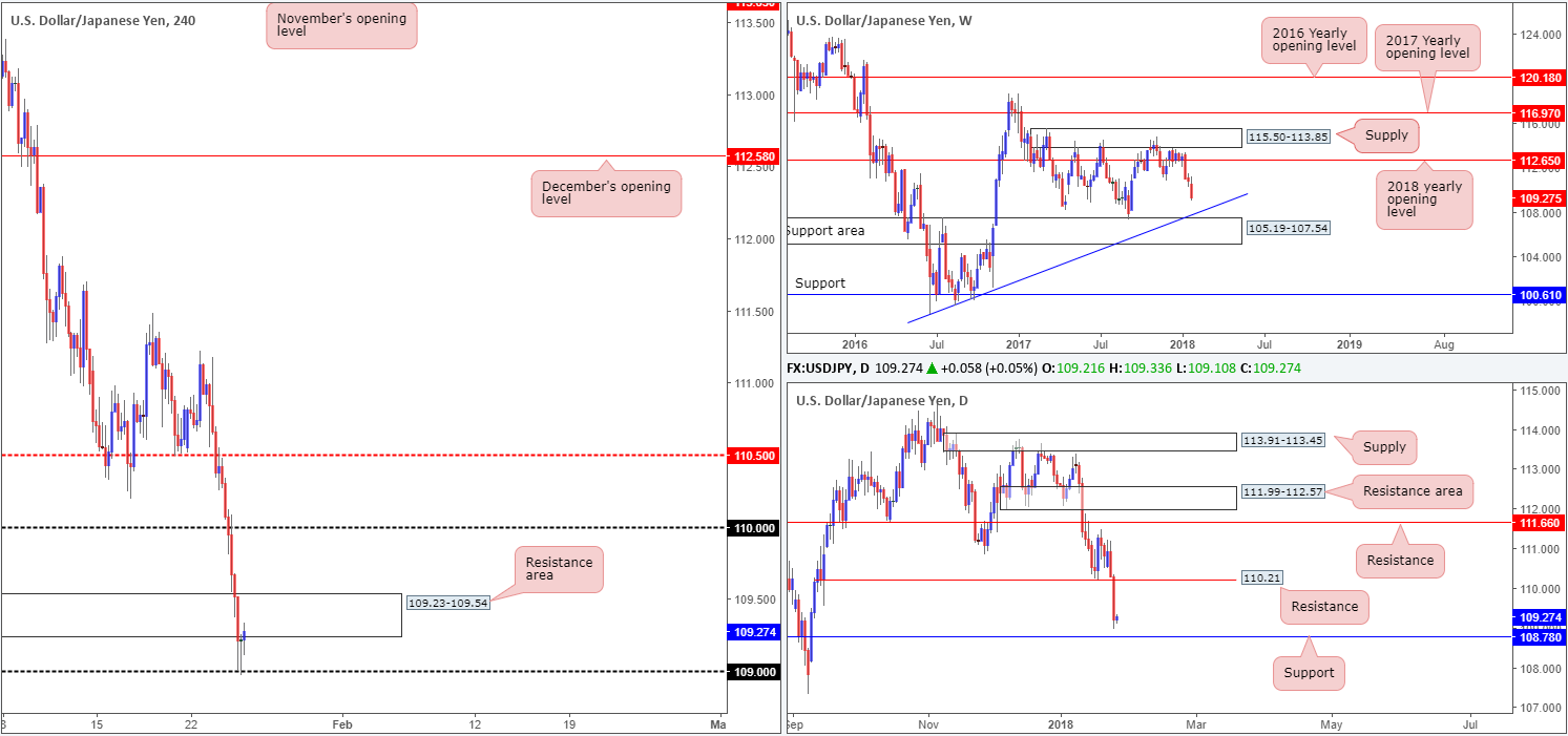 Across the pond on the H4 timeframe, the candles are seen attempting to recover from the 109 handle. However, there’s also a H4 resistance area in play at 109.23-109.54 which could potentially hinder upside. Also something to keep an eyeball on today is a possible (deep) fakeout through 109 to test daily support at 108.78.