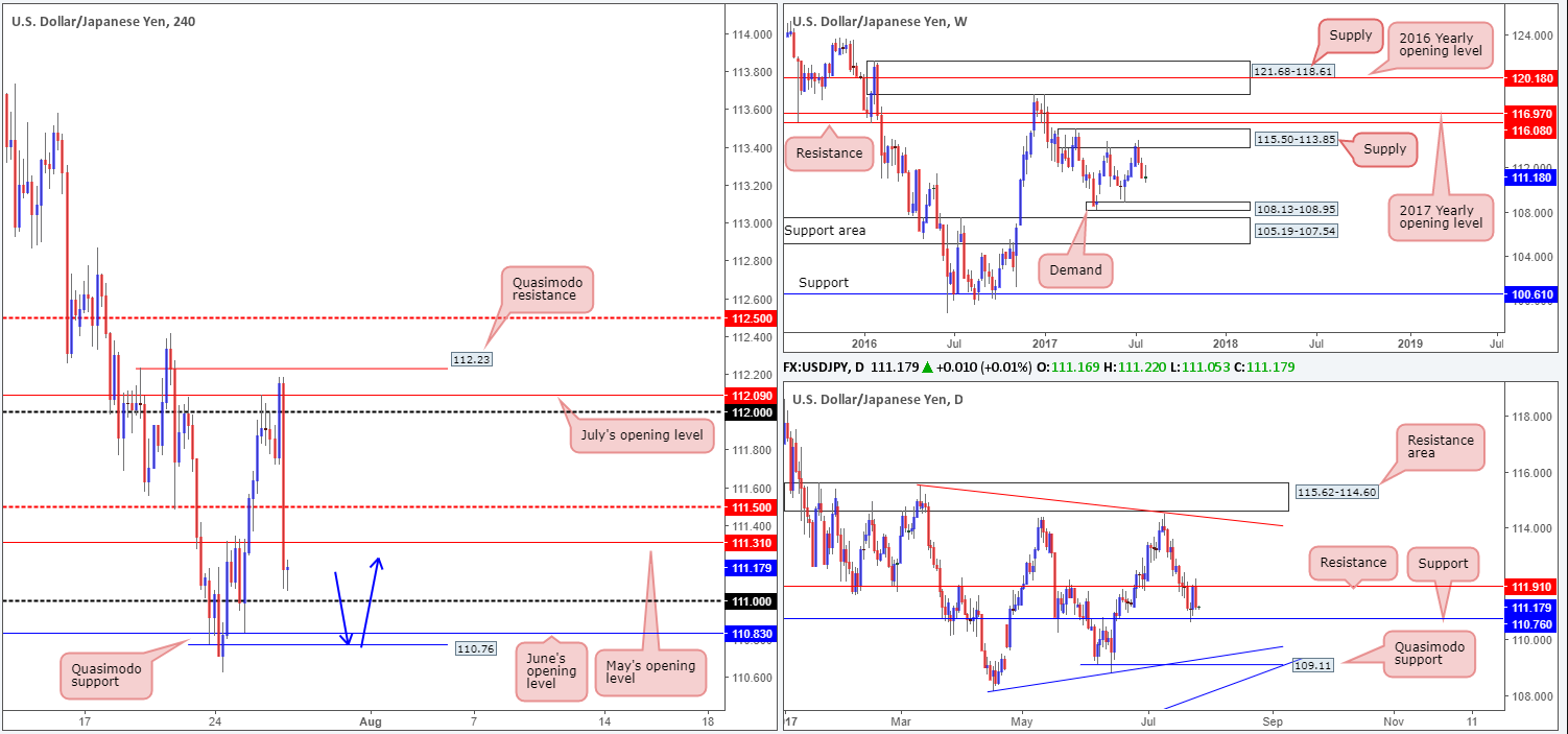 Our suggestions: On account of the above notes, this is how we are looking at this market right now. The 111 handle will likely possess willing buyers who will place stops 10-20 pips beneath this number. Below 111 is June’s opening level at 110.83, shadowed closely by a Quasimodo support at 110.76. Take note that this Quasimodo also aligns perfectly with the current daily support. So, given the stops (sell stops from both buyers looking to long 111 and also sellers looking to sell the breakout) planted beneath 111, we feel the big boys will breach 111 today and look to attack the 110.76 neighborhood for a trade long. The only grumble we have here, of course, is the fact that weekly price provides little support until we reach the 108.95 region. Despite this, we still feel the odds of a bounce being seen from the 110.76 level is relatively high.