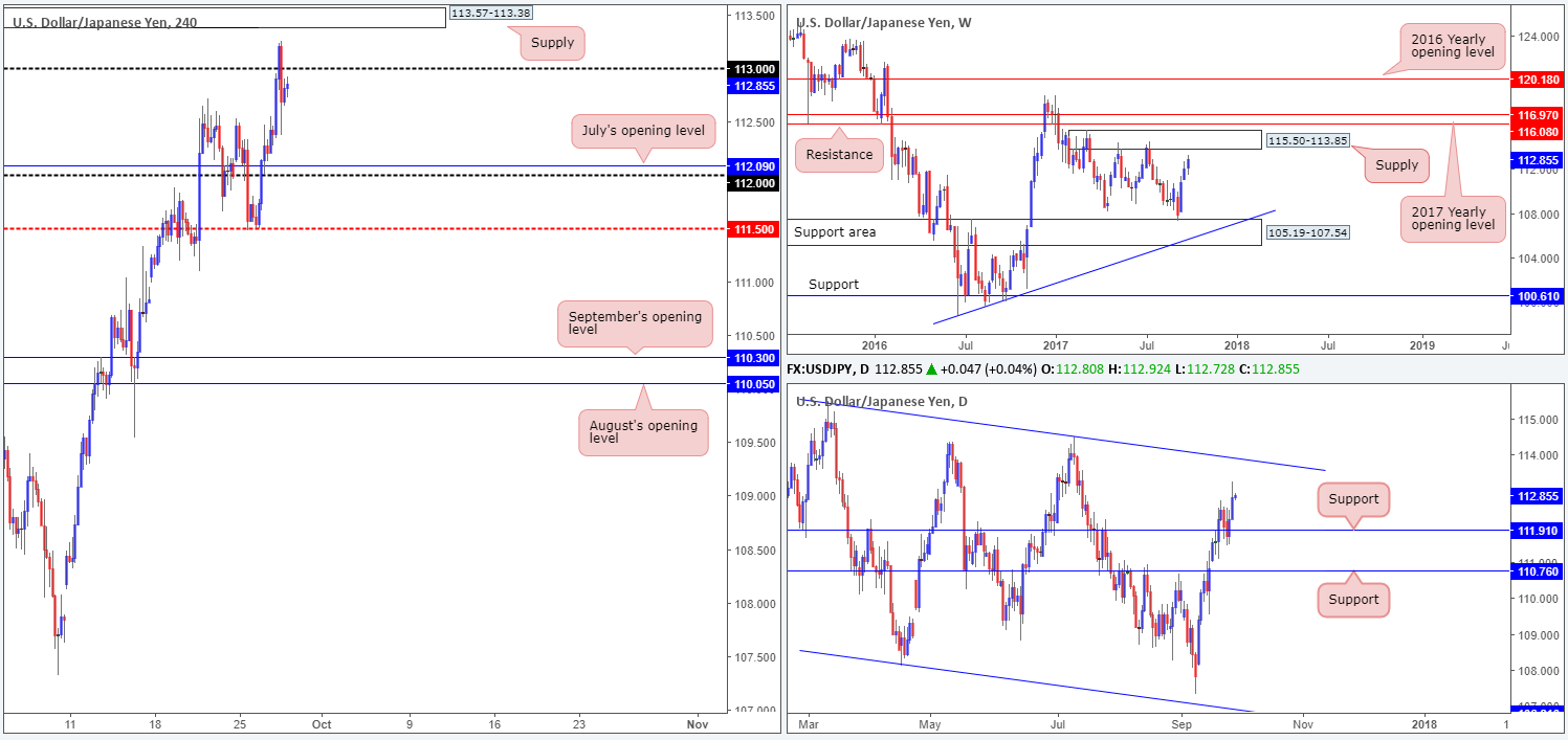 Across on the H4 timeframe, price strongly broke above the 113 handle going into the early hours of US trading on Wednesday. With the piece failing to generate much follow-through action above this number, the pair ended the day closing back below the 113 vicinity.