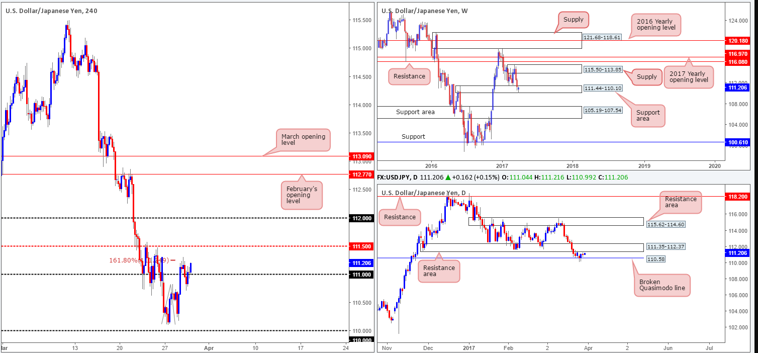In view of weekly bulls defending the support area at 111.44-110.10, the H4 mid-level resistance at 111.50 will likely be challenged today. 111.50 also happens to be housed within a daily resistance area at 111.35-112.37, which has capped upside since the 23rd March.