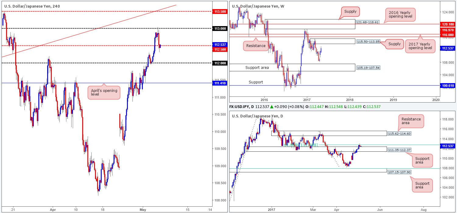 Our suggestions: A H4 close beyond 113 followed up with a retest and a reasonably sized H4 bullish (preferably full-bodied) candle would, in our humble opinion, be enough evidence to suggest the bulls remain in control and longs are now viable. The first take-profit target from here would be set around the H4 mid-level resistance at 113.50 which happens to converge with a H4 trendline resistance taken from the low 111.68, followed by the underside of weekly supply at 113.85.