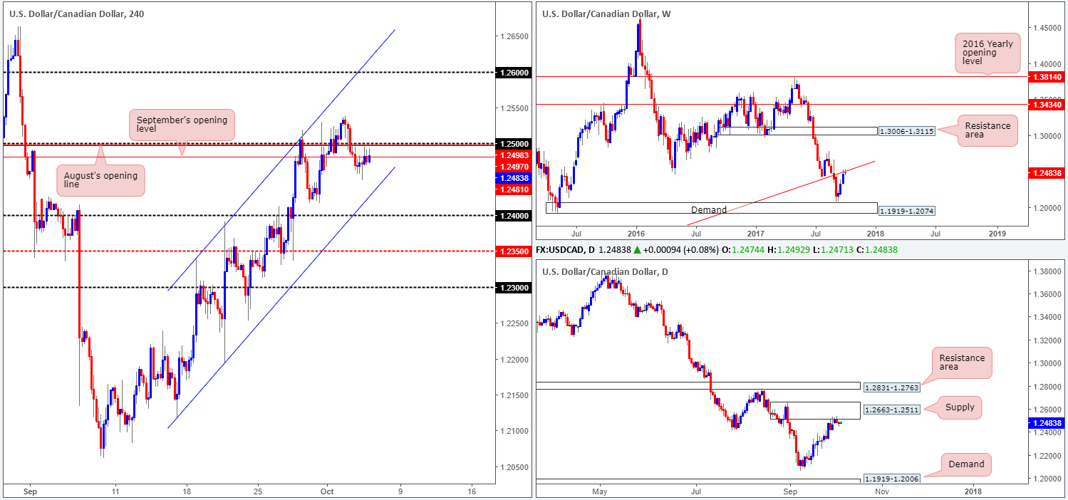 For those who read Wednesday’s report you may recall our desk mentioning that if a full or near-full-bodied H4 bearish candle closed below September’s open level at 1.2481, this would be considered a strong sell signal to short down to at least 1.24. We entered at 1.2468 shortly after we wrote this report, and placed a stop-loss order a few pips above the 1.25 handle at 1.2503. As you can see, the trade is still active but looks vulnerable to the upside at the moment.