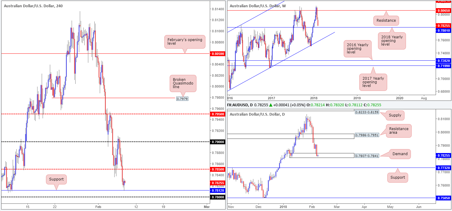 H4 support at 0.7812 (seen positioned a few pips ahead of the 0.78 handle) is currently holding ground and could encourage further buying back up to retest the recently broken H4 mid-level base at 0.7850. However, with weekly price seen approaching the 2018 yearly opening level seen on the weekly timeframe at 0.7801, the round number 0.78 may be brought into play today.
