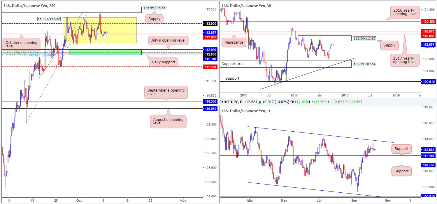 As expected, it was a quiet Monday given both US and Japanese banks were closed. H4 price spent the day trading in a confined range around October’s opening level at 112.64, after tapping a session low of 112.33 in early trade. Due to yesterday’s lackluster performance, much of the following report will echo thoughts put forward in Monday’s analysis…