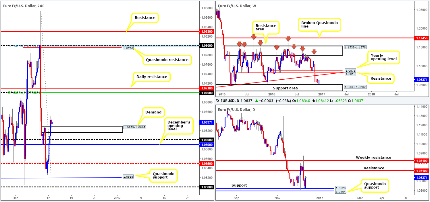 - Buys: 1.0629-1.0616 ([reasonably sized H4 bullish close required prior to pulling the trigger] stop loss: ideally beyond the trigger candle).