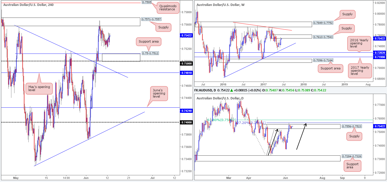Moving across to the H4 candles, price failed to reconnect with the support area formed at 0.75/0.7512 on Friday and instead found active bids nearby the 0.7520 neighborhood. With the higher timeframes indicating lower prices are likely on the cards, the supply base at 0.7571-0.7557 has been noted as a possible sell zone today given how well it held last week.