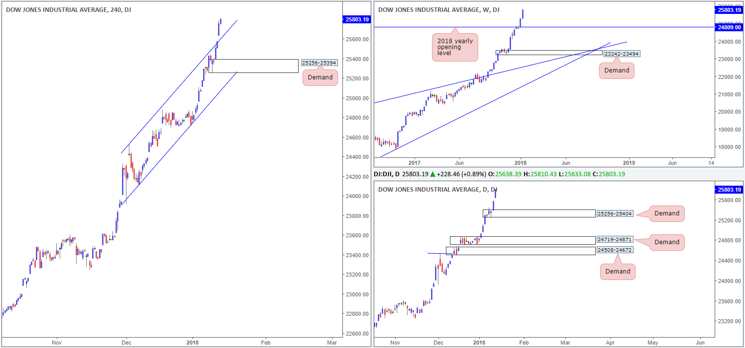 Over on the H4 timeframe, the H4 channel resistance extended from the high 24534 was taken out. This was the last remaining obstacle stopping the unit from reaching record highs. Now that this resistance has been cleared, the engulfed line could potentially be used as platform for buyers today/this week.