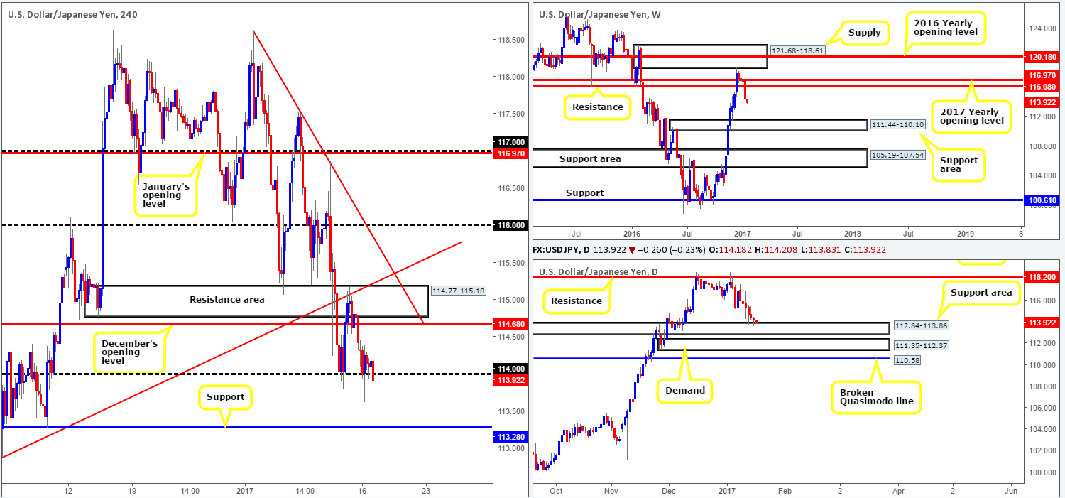 Over on the H4 chart, nonetheless, the 114 handle (after spending all day yesterday supporting this market) now looks to be on the verge of giving way. While this is considered a bearish signal and potentially opens the doors for price to challenge H4 support seen at 113.28, selling beyond 114 would be risky considering the daily support area currently in play.