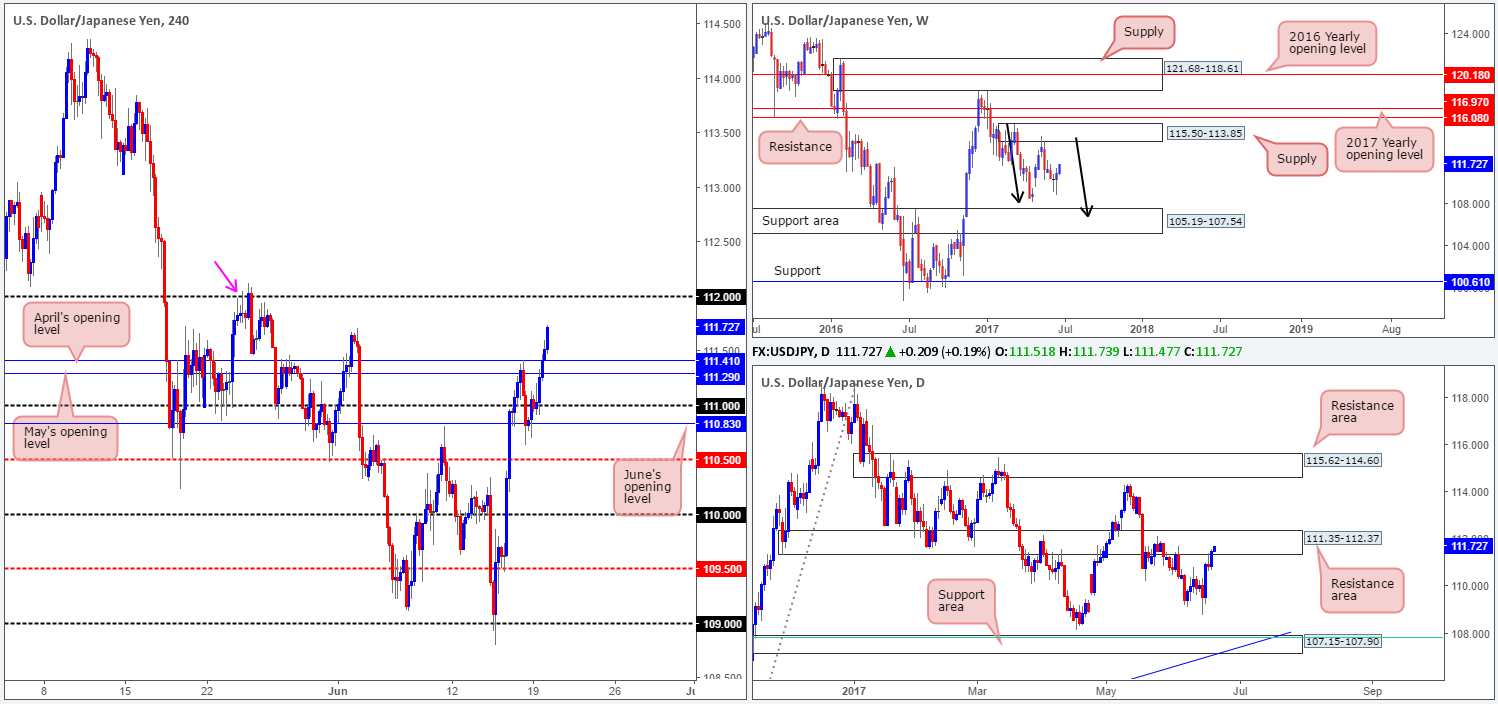 USD/JPY bulls went on the offensive during the course of yesterday’s trading, breaching multiple H4 tech resistances. As we write, H4 price looks poised to attack the 112 handle, which happens to intersect with a H4 left shoulder (Quasimodo formation) marked with a pink arrow. 112 is of interest to our desk today. Not only because of the Quasimodo convergence, but also because 112 is positioned within a daily resistance area drawn from 111.35-112.37 (been in play since the end of November 2016).