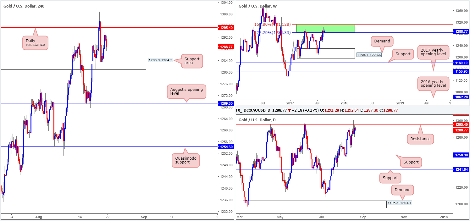 The story on the daily chart, nevertheless, shows price trading from a resistance level at 1295.4. Apart from the two instances on 17/04/2017 and 06/06/2017, there’s little history registered with this number! For that reason, we may see price break above this line and head to the resistance carved from 1308.4 (not seen on the screen), which boasts very attractive history dating back to early 2011.