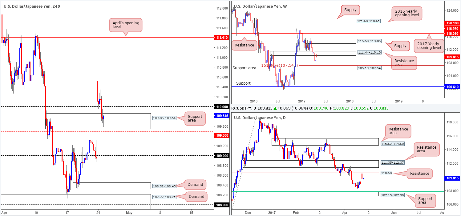 Having seen the USD/JPY aggressively gap over 150 pips north on Monday after a win by centrist Emmanuel Macron at the French presidential elections, the market then went on to retreat and gave back 50% of this move. Seeing price break back below the 110 handle and test the H4 support area seen at 109.86-109.54 has likely interested some buyers. Longs from this region, however, could be risky though. Weekly price has recently shook hands with a resistance area fixed at 111.44-110.10, and daily action came within a cat’s whisker of clipping the underside of resistance at 110.58. Therefore, we fail to see the bulls sustaining gains beyond the nearby 110 handle today.