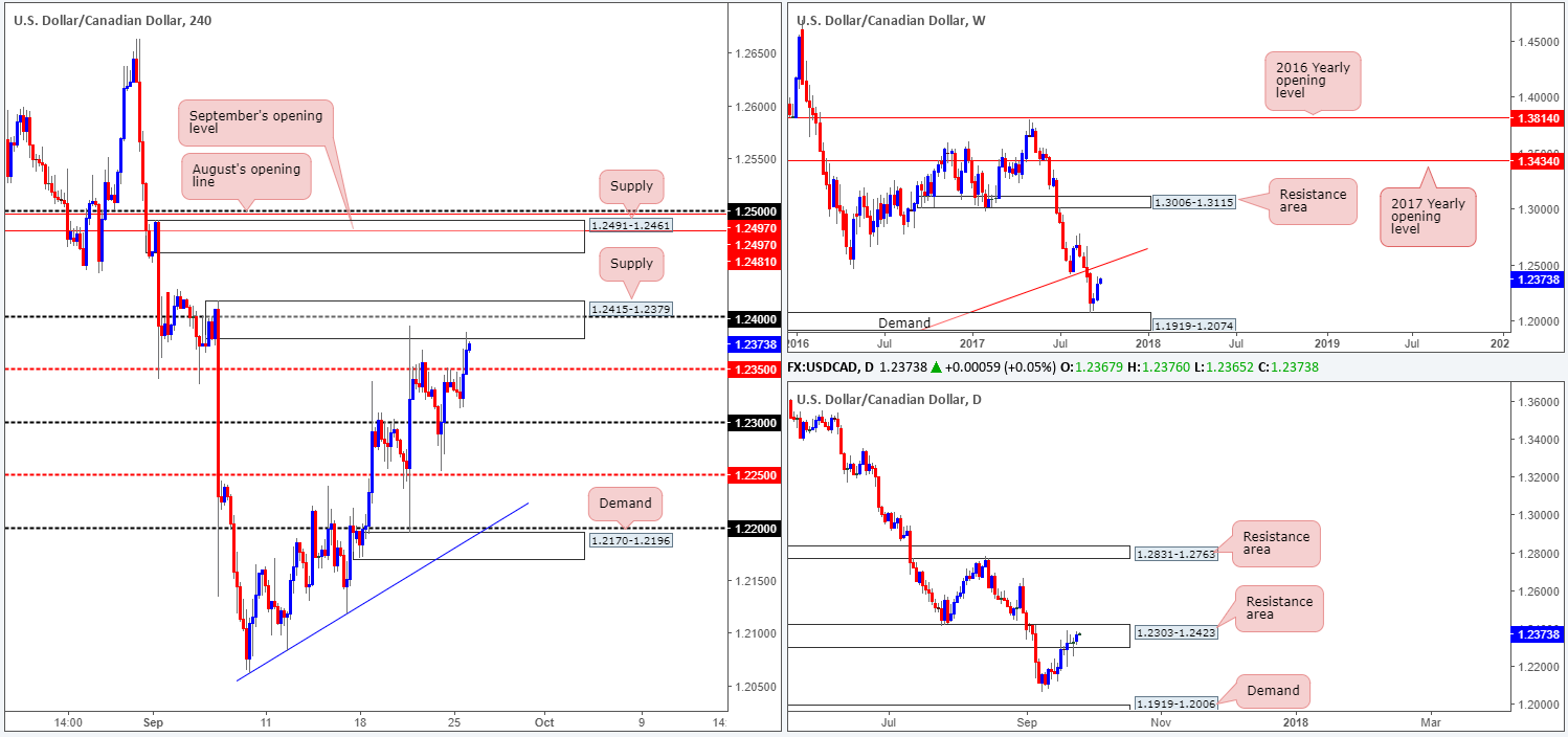 The USD/CAD, as you can see, switched tracks in early US trading yesterday. Offers at the H4 mid-level resistance 1.2350 were engulfed, allowing price to challenge H4 supply at 1.2415-1.2379 which fuses with the 1.24 handle, despite a rally in oil prices. Also of particular interest should be the fact that both of these areas are sited within a daily resistance area pegged at 1.2303-1.2423.