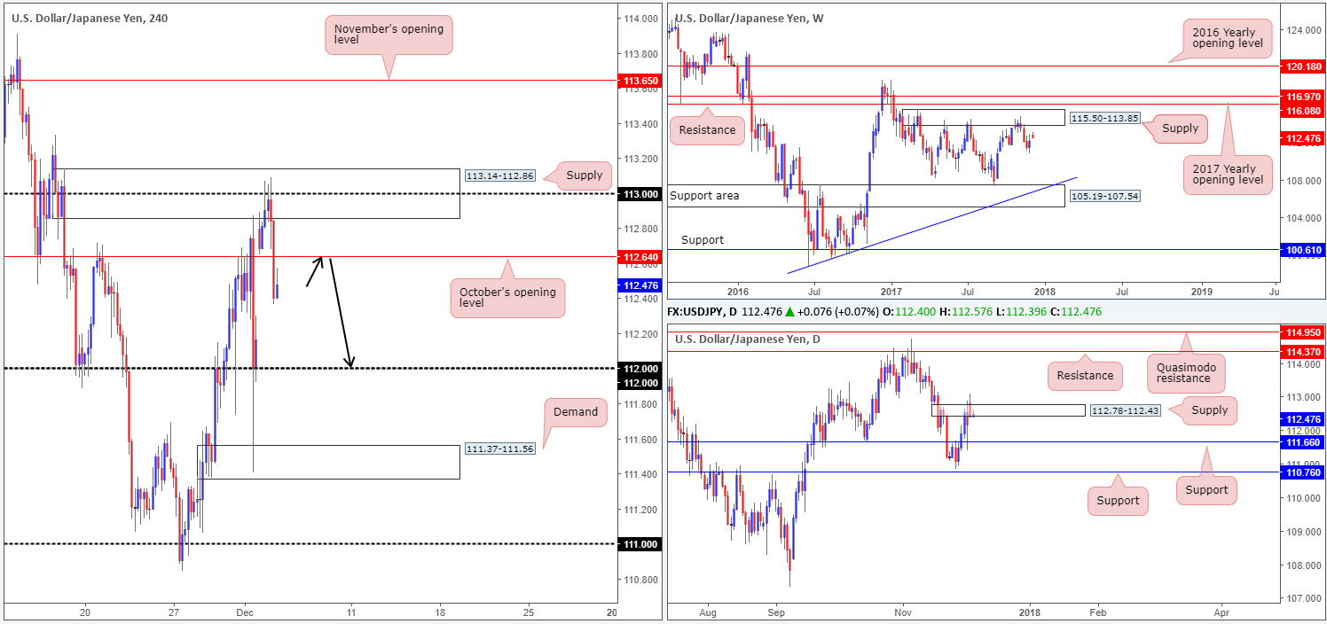 Suggestions: A retest to the underside of 112.64 on the H4 timeframe is, as far as we can see, a stable location to look for shorting opportunities. Besides having a daily supply bolstering downside at the moment, we also have the weekend gap which has ‘fill me’ written all over it. A sell from 112.64 is certainly something we’re interested in if H4 sellers prove intent in the shape of a full or near-full-bodied bearish candle. Assuming a trade comes to fruition, the 112 handle will be the first take-profit target, followed by daily support at 111.66.