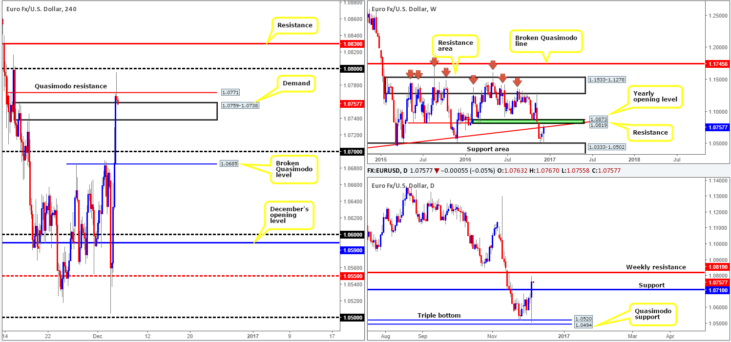 The single currency, as you can see, fell sharply in early trading on news of Italian Prime Minister Matteo Renzi’s resignation amid yesterday’s constitutional referendum. The pair managed to clock lows of 1.0504 before switching tracks and rallying just as sharply against its US counterpart. Several resistances were wiped out during this bullish assault, which ended the day with the unit piercing through a H4 Quasimodo resistance level coming in at 1.0771.