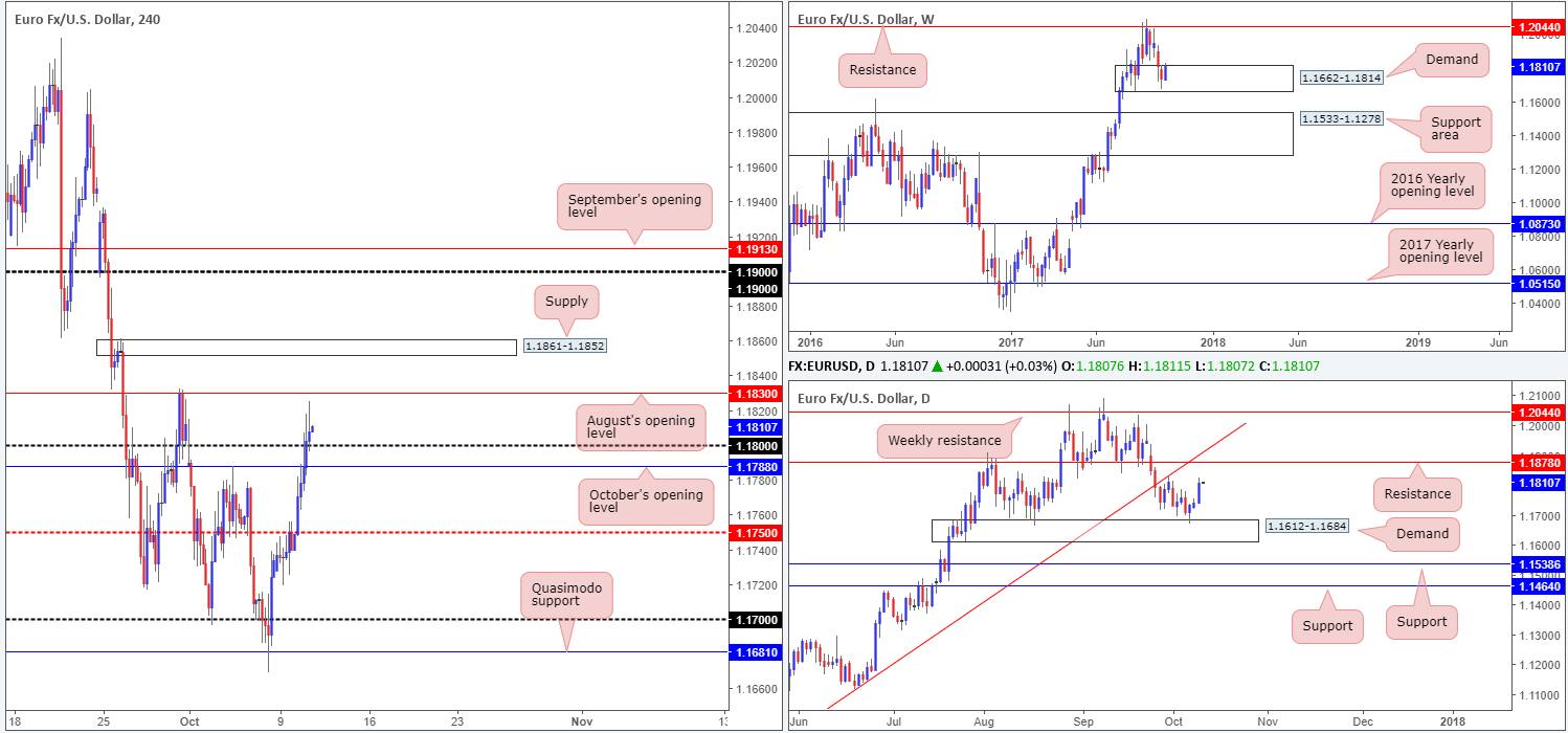 In recent trading, the single currency extended higher for a third consecutive session, pulling H4 price above October’s opening level at 1.1780 and the 1.18 handle. The euro rose as high as 1.1825 after Catalonia’s president struck a conciliatory tone in a speech about the region’s independence referendum (Bloomberg).