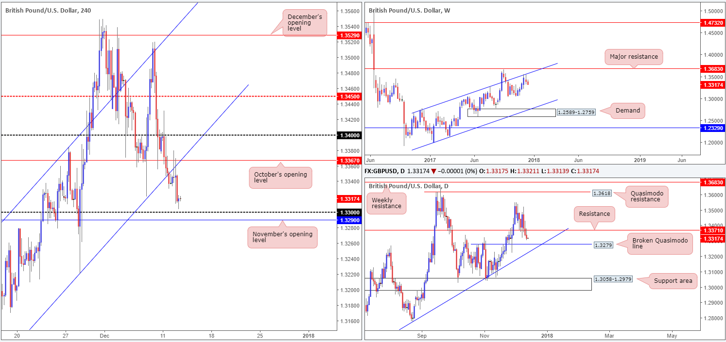 • Long: The pair concluded the day bottoming just ahead of the 1.33 handle/November’s opening level at 1.3290 (H4 timeframe). For that reason, these levels are likely under the spotlight for many traders this morning. With that said, however, it might be worth noting that a potential fakeout through these levels is a possibility, as directly below we have the aforementioned daily broken Quasimodo level. Adding to this, we also have selling pressure from the weekly timeframe to contend with. Therefore, trading long from the 1.33 region is not a trade that’s considered high probability.