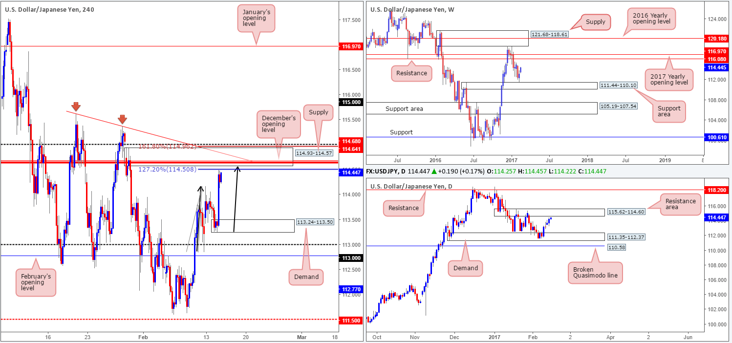 The impact of Yellen’s testimony drove the USD/JPY skywards yesterday, reaching a high of 114.49 on the day. To make a long story short, this has brought H4 price up to a nearby area of H4 supply at 114.93-114.57, which we feel will likely hold price lower today. There are a number of technical aspects that support this view: