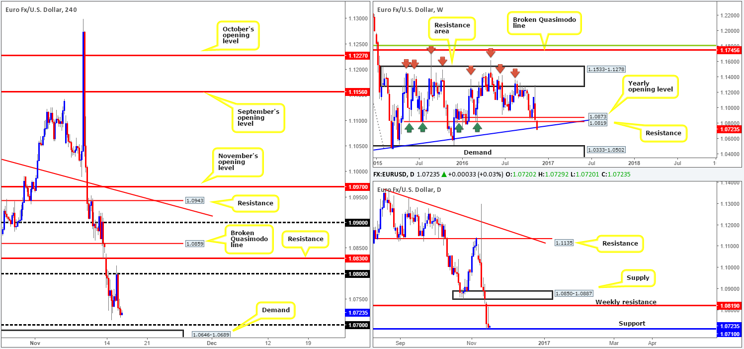 - Buys: 1.07 region ([watch for a H4 buying tail to form prior to pulling the trigger] stop loss: either beyond the demand at 1.0643 or beyond the H4 buying tail).