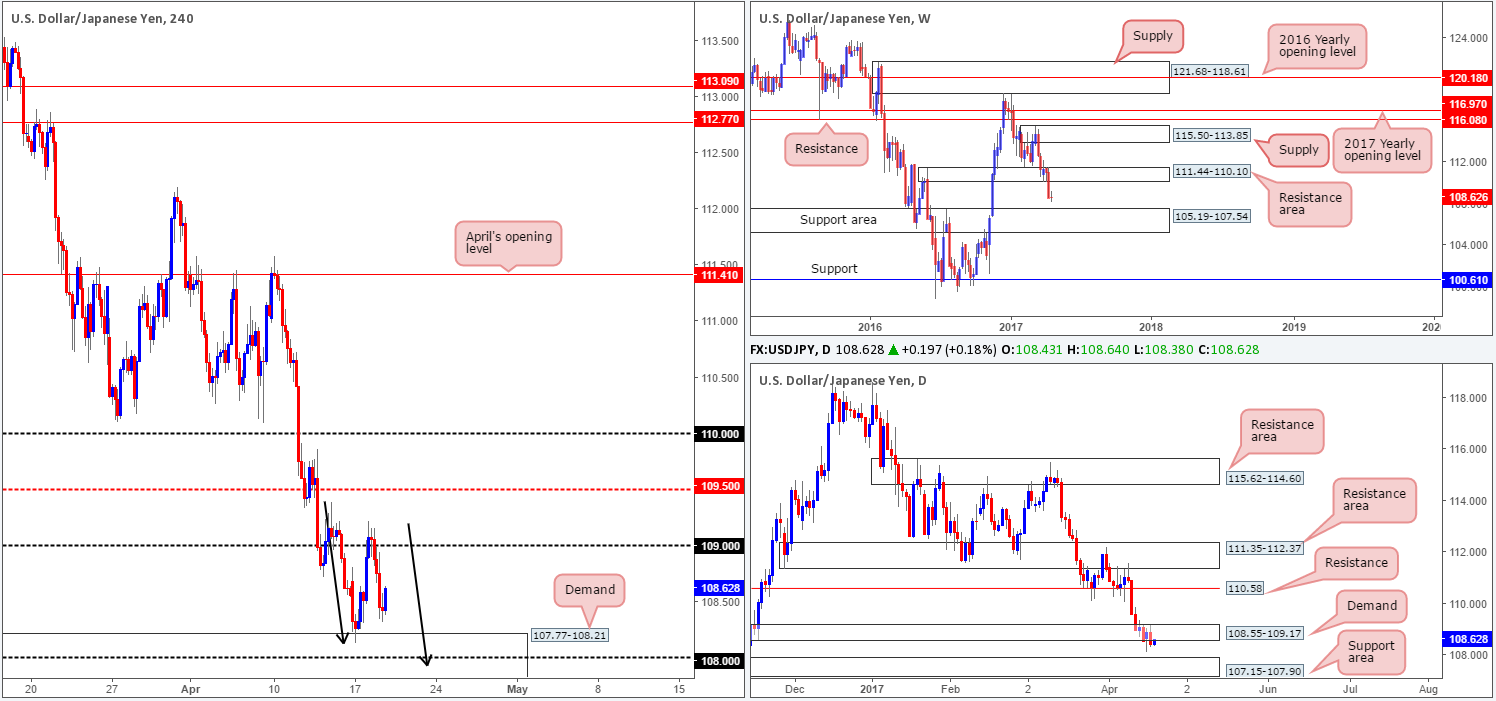 As can be seen from the H4 chart, the buyers failed to sustain gains beyond the 109 handle and dropped to a low of 108.32 into the close. Just ahead of current price sits a demand base coming in at 107.77-108.21, which holds the 108 handle within. Also of interest here is the approach: an AB=CD formation that completes just below the 108 number (see black arrows). Bolstering the noted H4 demand is a daily support area seen at 107.15-107.90, which itself is supported by a weekly support area at 105.19-107.54.