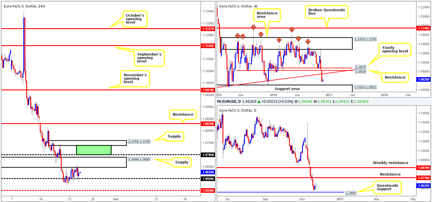 Selling from the 1.07 neighborhood on the other hand, is a reasonable possibility. Nevertheless, for those who agree with our analysis, you’d also need to be prepared for the possibility of a fakeout above 1.07 up to the underside of a H4 supply at 1.0759-1.0738 (the green zone represents a fakeout zone), as housed within this fakeout zone is the aforementioned daily resistance.