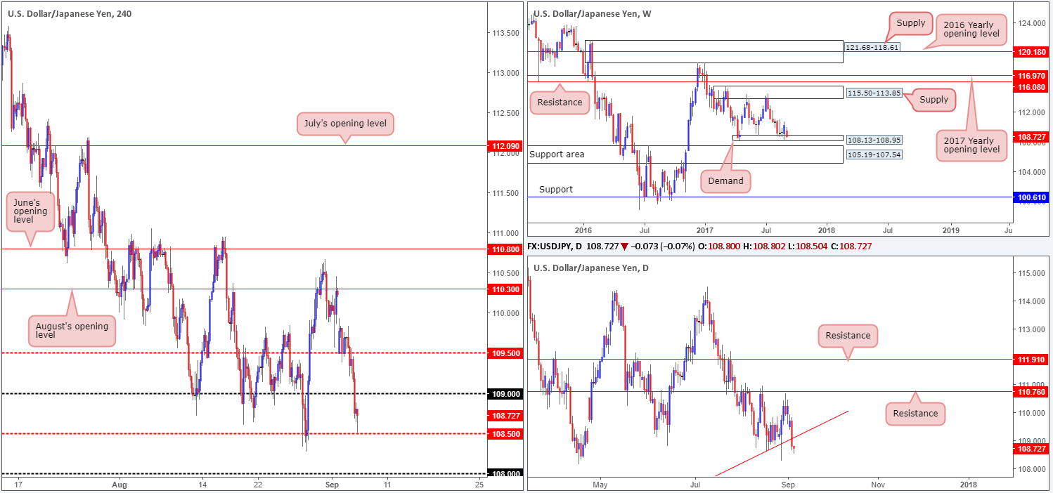 According to weekly structure, demand at 108.13-108.95 is struggling to hold firm at the moment. A violation of this zone could see the pair sink into a nearby support area fixed at 105.19-107.54. Recent action on the daily timeframe reveals that price crossed below a trendline support extended from the low 100.08, thus further confirming weakness within the said weekly demand area. The story on the H4 timeframe, however, shows that yesterday’s dollar selloff dragged price below the 109 handle and eventually into the jaws of a mid-level support drawn from 108.50.
