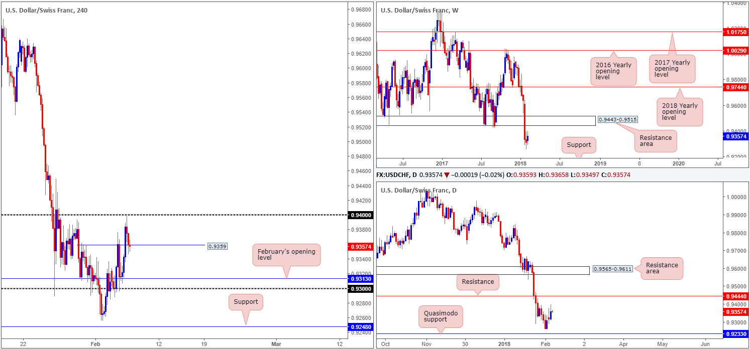 An unrelenting push to the upside was seen in recent trading from February’s opening level (H4) at 0.9313, which only really saw any form of resistance after coming within shouting distance of the 0.94 handle. This, as you can see, brought a local H4 support into play at 0.9359, which for now, is holding ground (current H4 candle is printing indecisiveness).